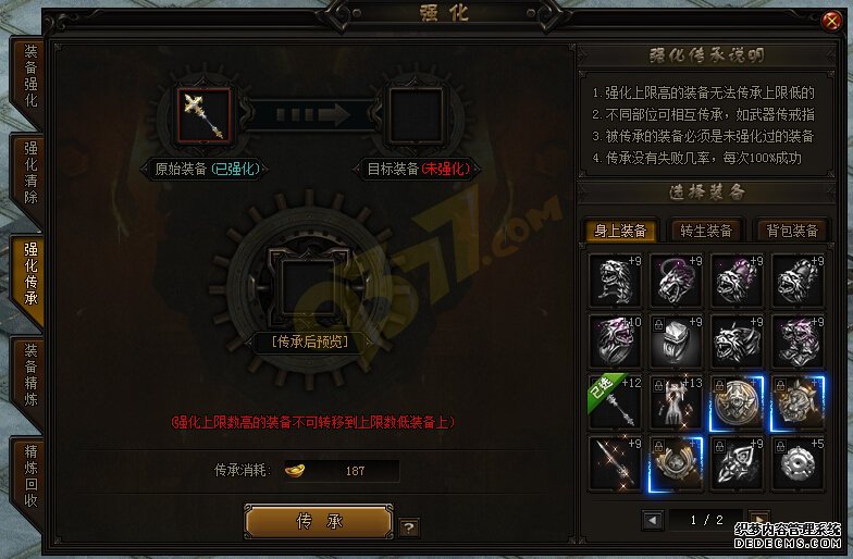单职业传奇强化系统中的强化传承是指将强化装备的等级转移到另一个装备身上,一般用于装备更新换代的时候使用,不同部位可以进行相互传承。不同于装备强化这类成功率随强化等级增高而逐步降低的强化,强化传承是必定成功的。其主要目的是为帮助玩家节省装备再次强化的消耗。
